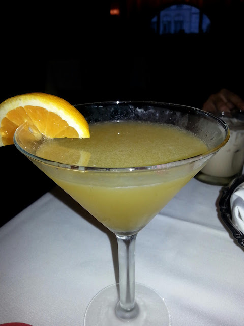 Hubby's drink. He got a White Russian. The thing on the plate next to the drink is parts of a fried banana. It tastes OK but hubby and I figured they serve that to help cleanse the palette a bit.